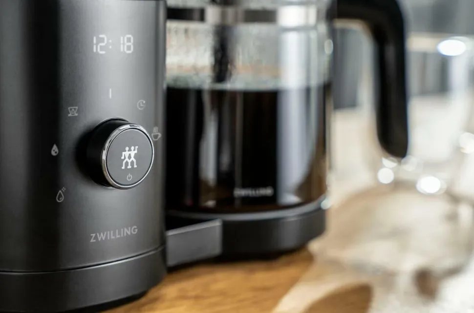 Zwillings prisvindende kaffemaskine er designet med effektivitet, kvalitet og topmoderne funktioner. Kaffemaskinen holder en konsekvent bryggetemperatur på 92 til 96 °C. Dette giver en optimal brygning og fyldig kaffearoma. Indersiden i rustfrit stål er meget korrosionsbestandigt og meget holdbart. Det ændrer heller ikke på smagen af bryggevandet, sammenlignet med kaffemaskiner, der har kobber- og aluminiumselementer. Kaffemaskinen har et kraftigt brusemundstykke i rustfrit stål, der drypper vandet jævnt over kaffepulveret. Dette giver en “blooming effekt” som giver en blødere smag med maksimal aroma. Da denne effekt hjælper med at frigive kuldioxid fra kaffepulveret, reducerer den også den sure smag, der kan opstå hos nogle andre kaffemaskiner. Den elegante glaskande, der følger med, har en kapacitet på op til 12 kopper og et komfortabelt stabilt håndtag. Kaffemaskinen har både LCD-display, timerfunktion og et rengøringsprogram, der fortæller dig, hvornår det er tid til vedligeholdelse. Automatisk varmetilbageholdelse med optimal temperatur i 30 minutter, før den slukker. Zwillings kaffemaskine har fået den prestigefyldte SCA Golden Cup Standard, Specialty Coffee Associations højeste pris for kvalitetskaffemaskiner.