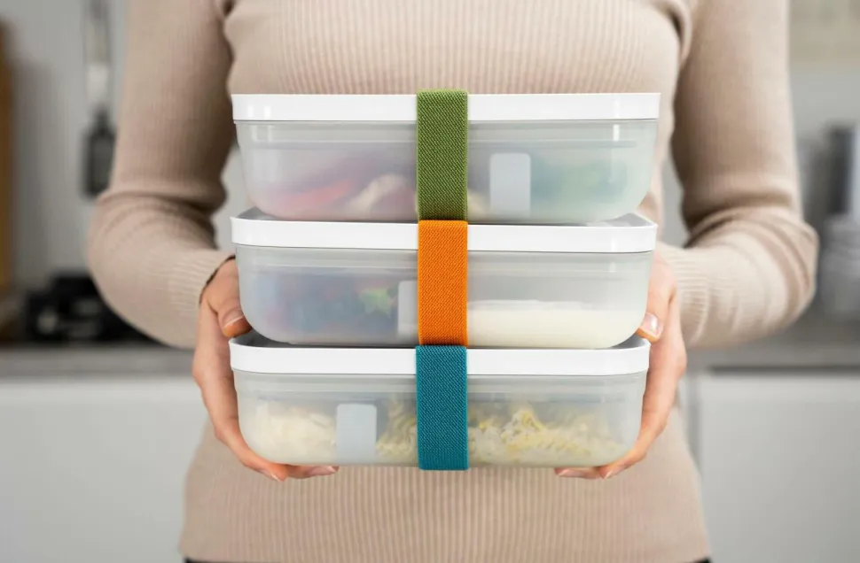platsbesparande stapelbar förvaring av mat och måltider i kylskåp och frys